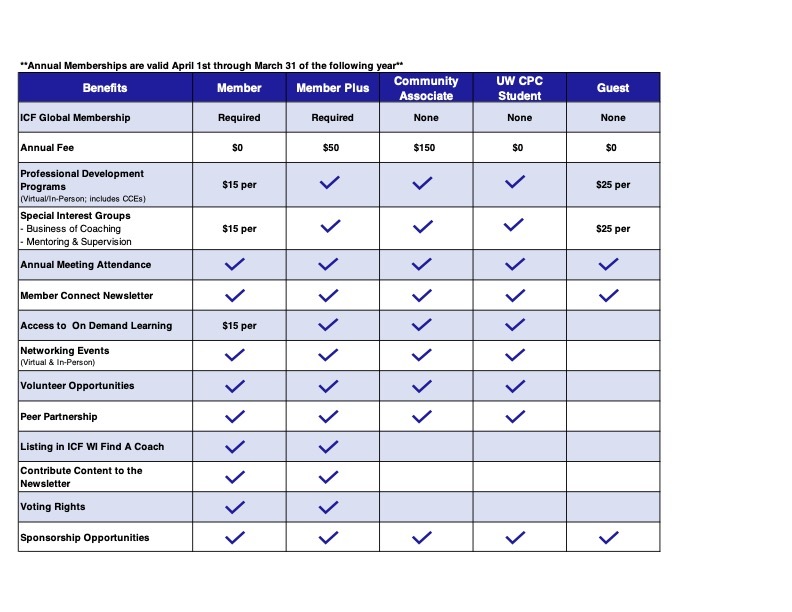 To get the most out of your ICF-Wisconsin membership, we invite you to explore our MemberPlus option. MemberPlus is an upgrade of your ICF member status. With MemberPlus, you receive an all access pass to ICF-Wisconsin events and resources.